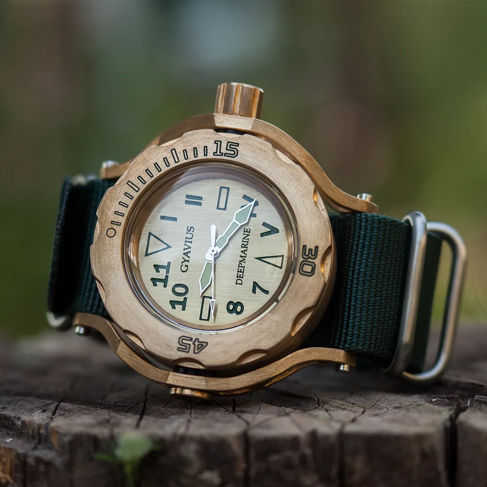 BezelSolid Bronze 60 click, bi-directional | CrownSolid Bronze Double sealed, screw down. |