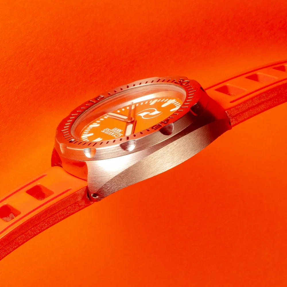 DialMatte Orange, hand printed White Superluminova, hand applied lume | Water Resistance100ATM tested |